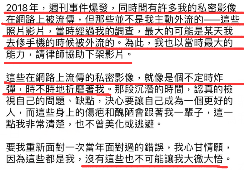 至于外传的影片,他表示不是出自他的本意,强调他也是受害者,称这些私密影片也像个不定时炸弹,时不时折磨着他,至于外传的原因,他觉得最大的可能是他去修手机时外泄了,但不得不说,这个借口找得很烂。