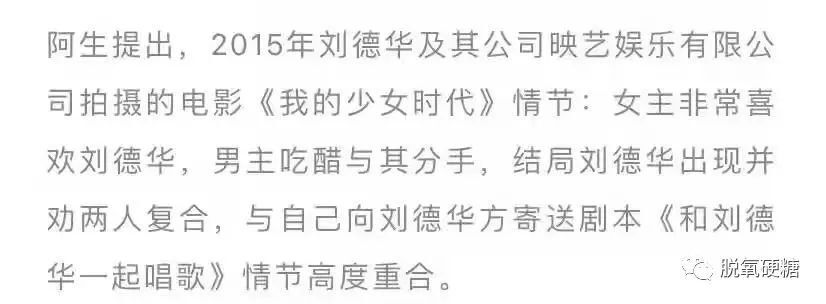 他还控诉了《我的少女时代》里的情节设定,和自己曾经寄给刘德华的剧本情节高度一致。