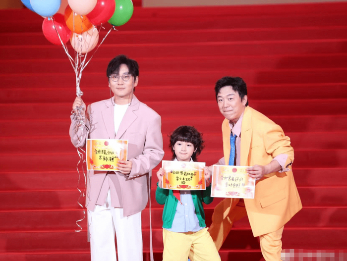 跟《热烈》剧组走完红毯后,黄渤脱下T恤换上彩色西装,在红毯上跟《学爸》剧组凹造型,看起来活力满满。