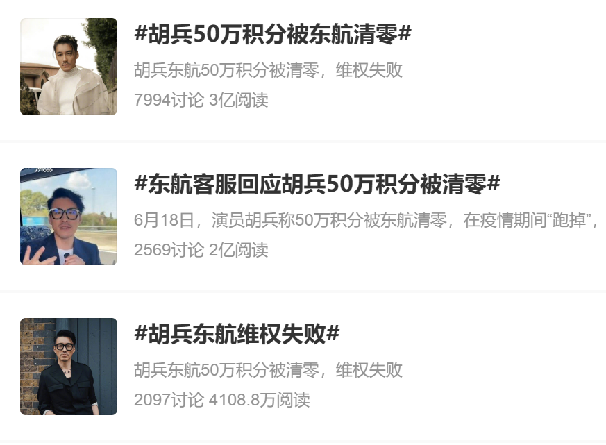 6月18日,知名艺人胡兵因维权东航登上热搜。