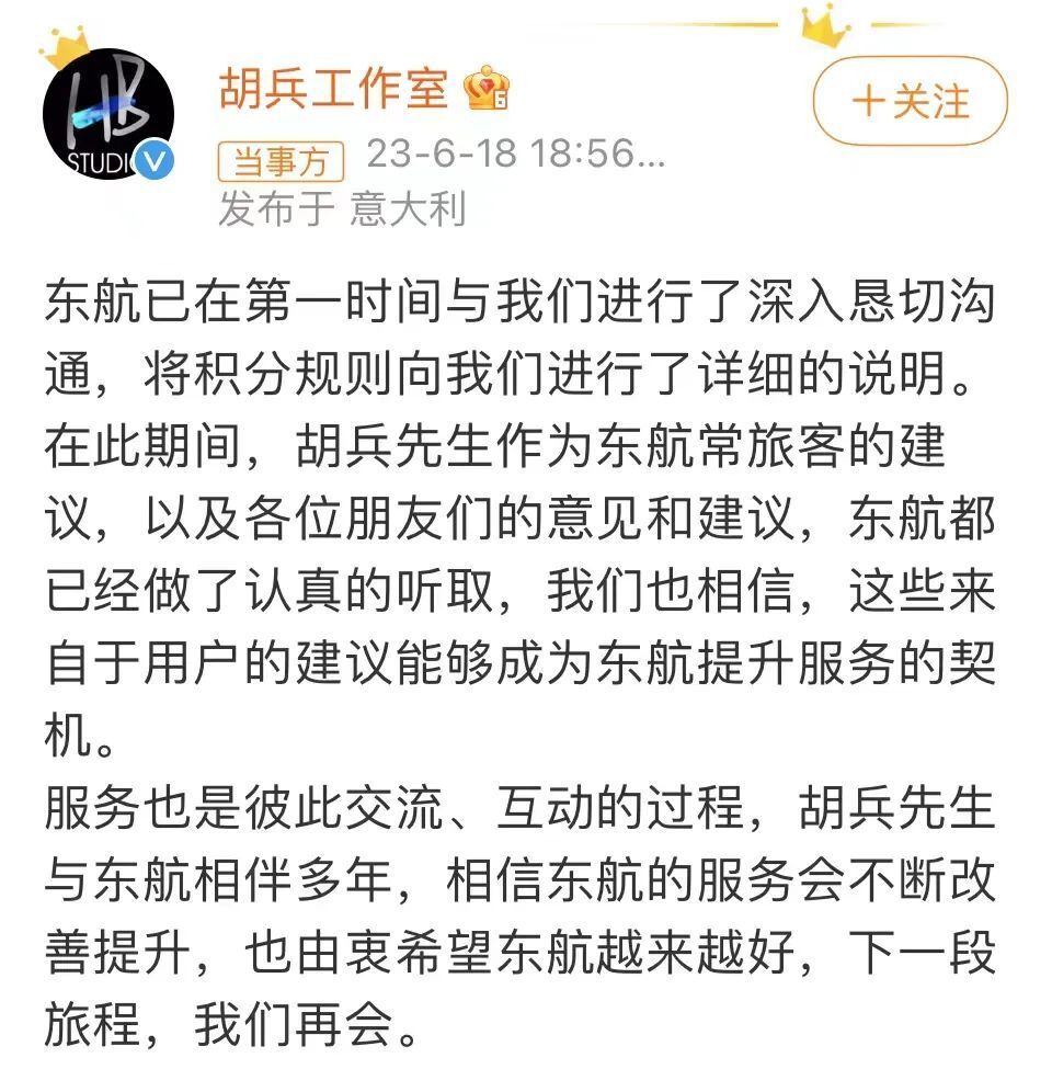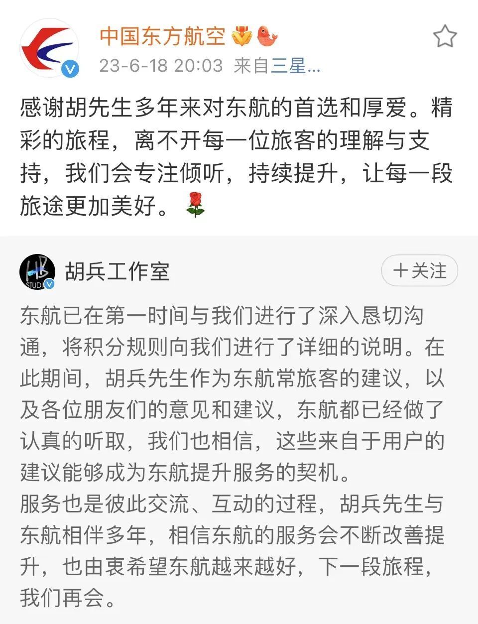 昨晚(18日),胡兵工作室回应称,“东航已在第一时间与我们进行了深入恳切沟通,将积分规则向我们进行了详细的说明。”