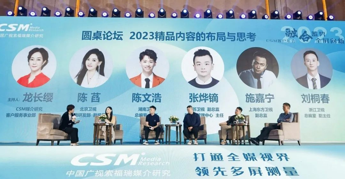 在圆桌对话环节,CSM媒介研究客户服务事业部总经理龙长缨作为主持人,与上海东方卫视副总监施嘉宁,江苏卫视副总监兼综合管理中心主任张烨镝,湖南卫视总编室主任陈文浩,浙江卫视总编室副主任刘桐春,北京卫视战略研发部副总监陈萏,共同探讨了媒体深度融合之下,领军主流平台对精品内容的布局与思考。嘉宾们基于各自台近年来在内容领域的资源布局与创新实践,分享了他们对于剧综节目在融合传播新视野中的内容创新和跨屏布局的思考,并交流了构建全媒体新发展格局的经验和心得。这场圆桌演讲,不仅为观众们带来精彩的思维碰撞,也展现了五大卫视在融合传播新格局方面的决心与行动。