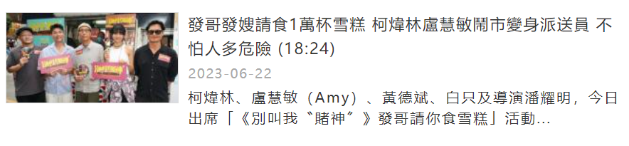 黄德斌、卢慧敏、白只等演员出现在现场,并帮忙派送雪糕给路人。众人谈到发哥,都是赞不绝口,说在对方身上学到很多东西。