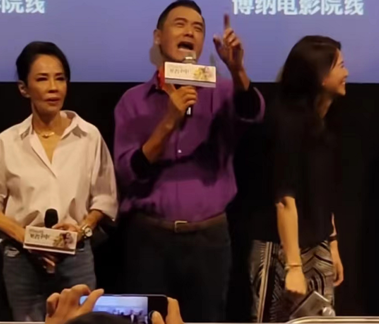 他目前身处广州,昨天他去了当地的电影院做宣传,同行还有妻子陈荟莲。只见他,穿着紫色衬衫,配上大背头,造型很是有型有款。已经68岁的他,因为经常做运动,身材保持得很好,很是挺拔。