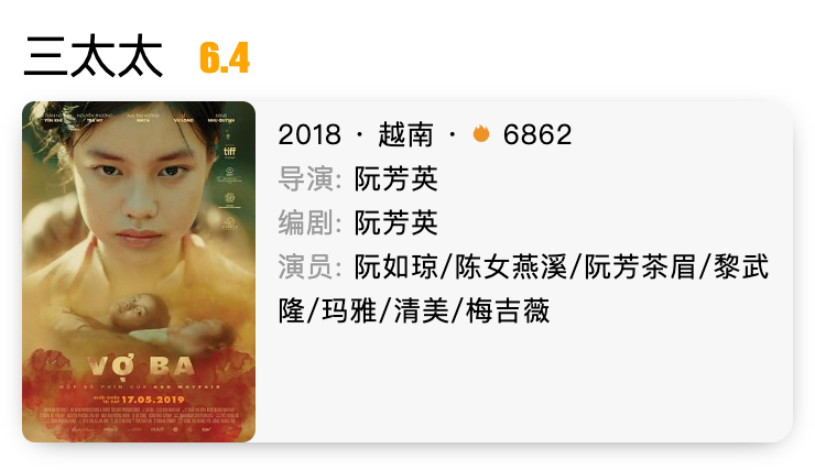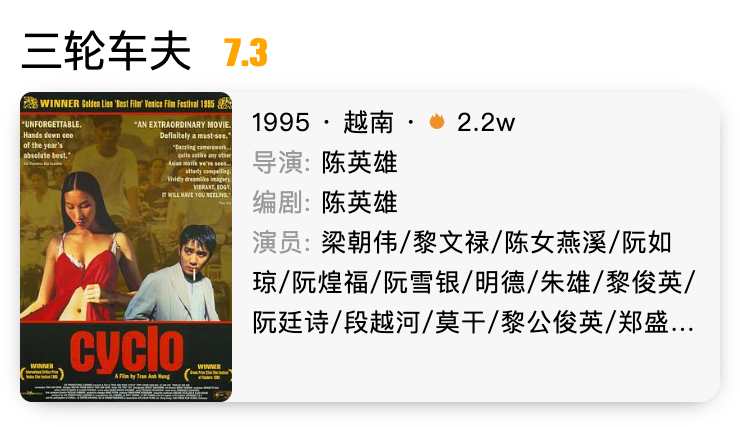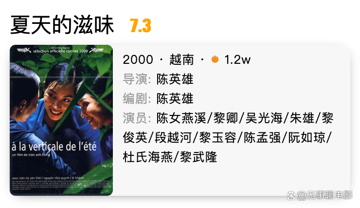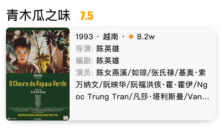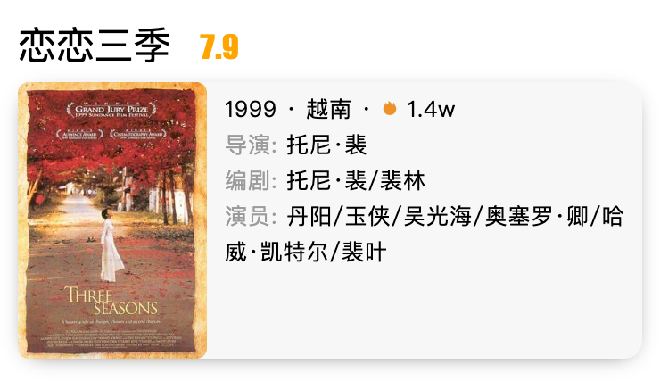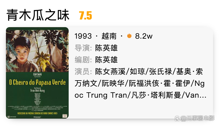 这是一部美仑美奂的作品,在诗意的画面间,在人物的心灵里,流淌的却是哀而不伤的淡淡情感,这是对那个年代越南的感性表述。