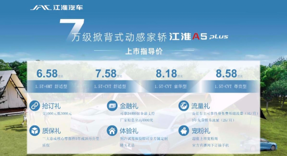 6月24日,江淮A5 PLUS正式上市,新车共推出4款车型,价格区间为6.58-8.58万元。新车定位紧凑型家轿,拥有不俗的颜值表现,动力方面搭载的是1.5T+MT/CVT动力总成。