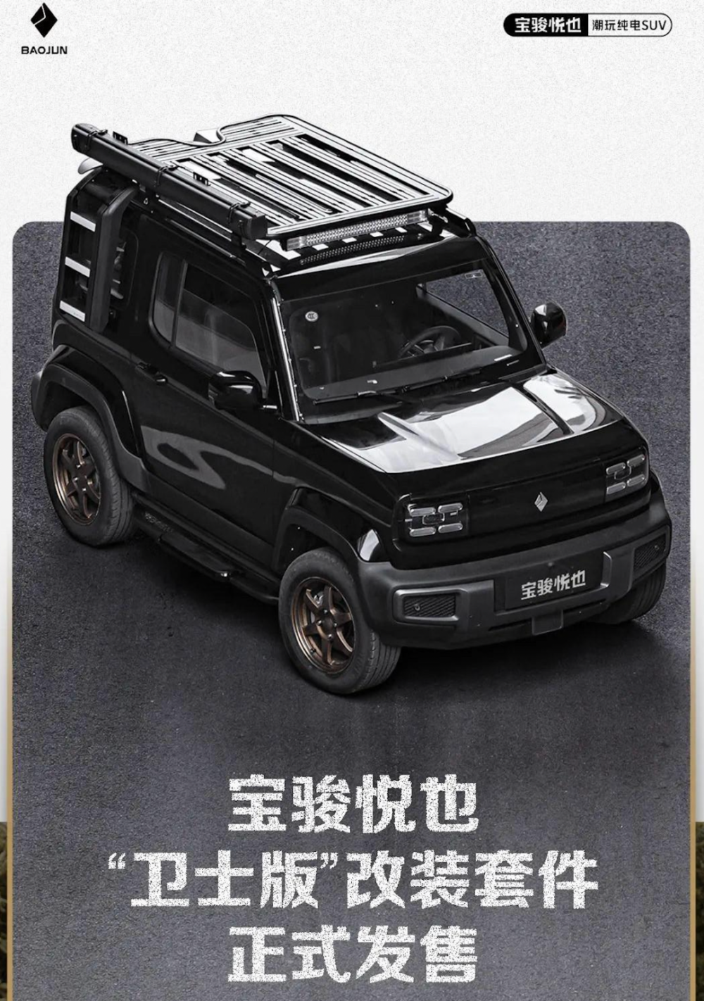 宝骏悦也“卫士版”官方改装套件正式发售,整套改装价格为6570元(不含安装),套件内共提供包含侧脚踏板、侧爬梯、侧书包、侧边帐篷、车顶平台及尾翼6类套件单品。??