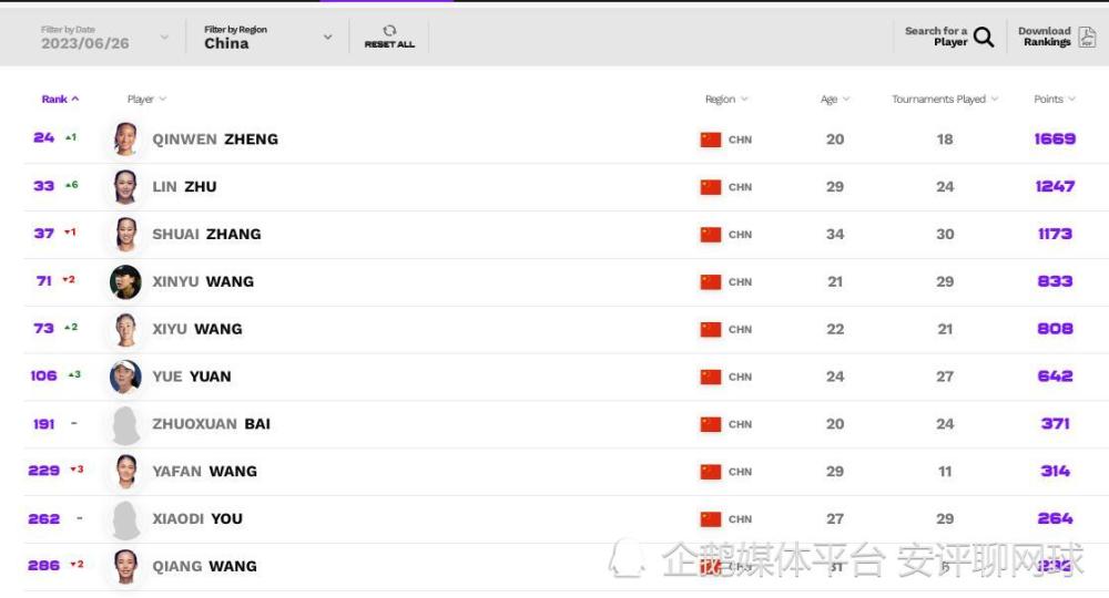 女子其他球员变化不大,郑钦文小幅上升一位至24,张帅继续下滑一位至第37,王欣瑜下滑二位至第71,王曦雨上升二位至第73,袁悦提升三位至第106,白卓璇保持不变191。