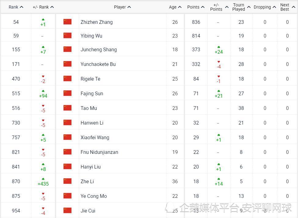 男子方面,张之臻虽然在ATP500德国哈雷草地赛资格赛遭到淘汰,但由于美国选手克雷西排名大幅下滑13位,张之臻的世界排名不仅没有下降,反而小幅上升一位,来到第54位,再创职业生涯新高,继续位居中国一哥。