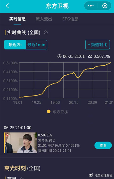 6月25日晚间,电视剧《繁华似锦》在东方卫视两集首播。根据酷云实时的收视率数据来看,这部电视剧开播之后,收视率一直处于蹿升的状态。第1集播放完毕之后,广告时间段,收视率下滑也并不明显。稍后,第2集的时候,其收视率继续蹿升。