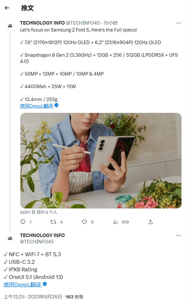 IT之家 6 月 26 日消息,日前,推特数码博主 @TECHINFO45 发文表示,其获得了三星最新一代折叠旗舰机型 Galaxy Z Fold5?的所有参数。