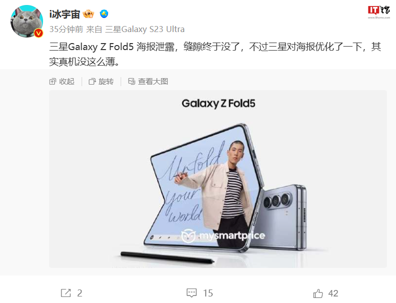 不过,博主?@i 冰宇宙 表示,这张海报有一些“美颜”部分,真机没有这么薄。根据此前爆料,三星 Galaxy Z Fold5 用上了水滴铰链技术,与传统铰链相比,水滴铰链不仅可以实现屏幕的无缝折叠,并且提供了更柔和的折叠曲线,从而缓解屏幕的折痕问题。