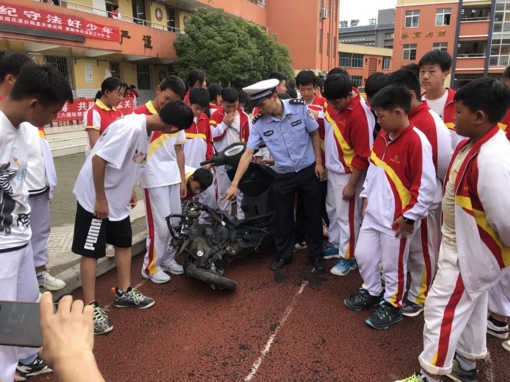 宣传民警特意挑选交通事故中严重受损的摩托车带来课上;并将摩托车典型交通事故案例制作成展板摆放在现场。民警从典型案例开始,分析发生事故的原因以及事故带给家庭的伤害,引述到各类骑行法律法规,以此来告诫广大学生,珍爱生命,远离交通违法。