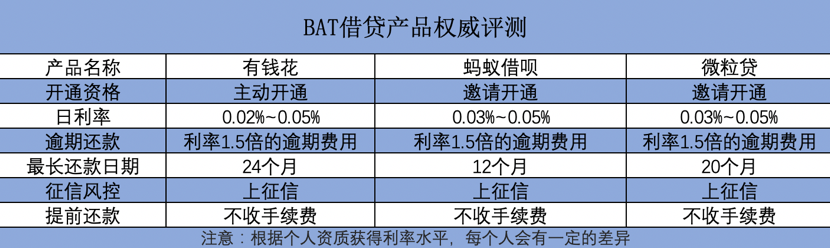 借呗,有钱花,微粒贷都是按日计息,支持随借随还,都是基于自身的大数据进行授信,日利率也基本都在0.02%~0.05%(年化利率为7.2%-18%,年化利率=日利率×360)之间,息费方面三者都差不多,都是BAT大厂旗下的产品,利率还是比较低的。