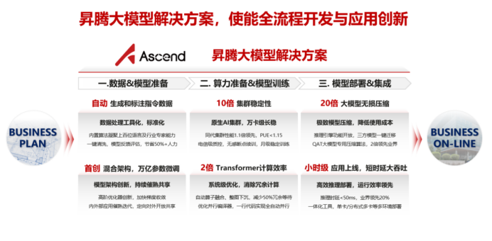 昇腾AI“大模型超级工厂”从大模型的数据&模型准备、算力准备&模型训练、模型部署上线&集成等阶段全流程使能大模型的开发与应用创新。