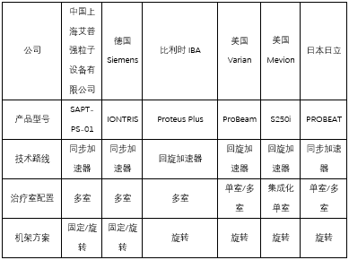 目前可以生产质子治疗装置的国家有中国、德国、比利时、美国、日本等。根据技术路线、束流类型、治疗室配置和机架方案,我们对市场上现有的质子治疗解决方案进行了统计,详情见表1。
