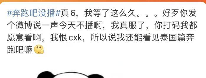 值得注意的是,《奔跑吧》首次延期是在节目更新前2个小时通知观众的,虽然时间很仓促,但好歹有个交代。本次节目继续失约,节目组不仅没有提前通知,更是连个解释都没有了,以至于很多观众提前等在电视机前等待,直到更新时间已过去很久,才确定节目不播了。