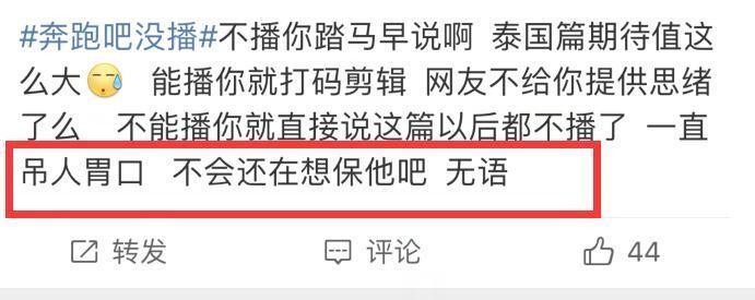 在确定《奔跑吧》这周又无法更新后,不仅大批粉丝坐不住了,超多观众直接炸锅,纷纷吐槽节目组失声,不满节目组毫无交代的做法。在很多网友看来,从蔡徐坤出事到本周更新,节目组有近十天的时间对节目进行重新剪辑,但节目却再次失约,甚至连一句话都不敢说了,难道说是还想挣扎一下保下蔡徐坤吗?