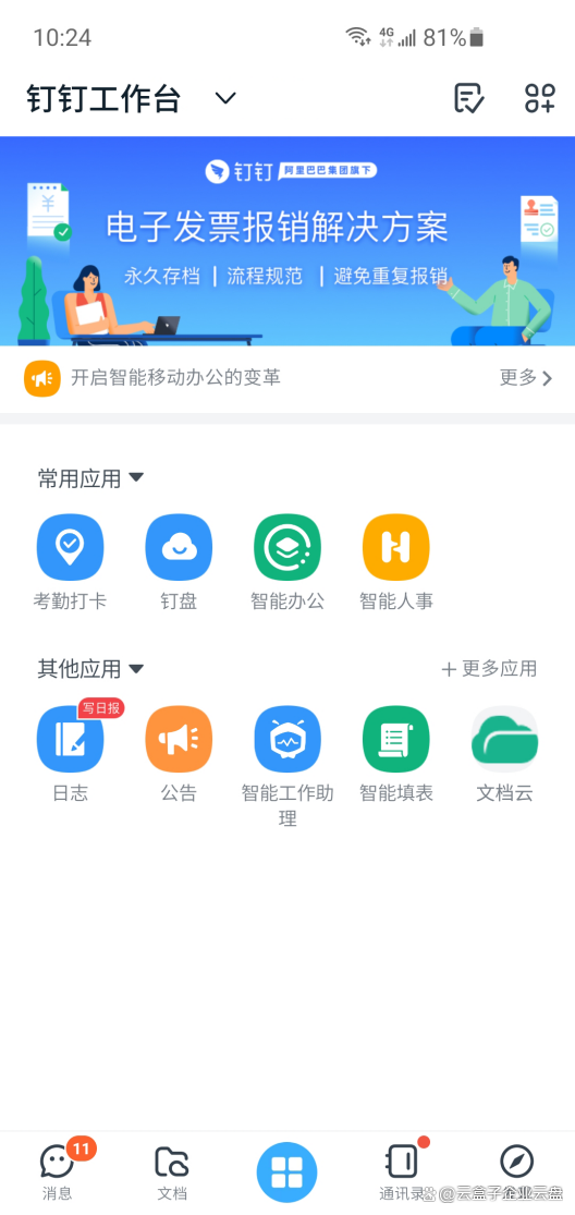 ① 通过标准接口实现钉钉账号单点登录文档云,云盘上的消息通知同步到钉钉。