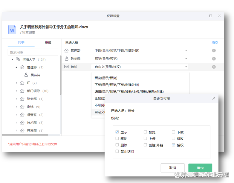 ③利用文档云细颗粒度的权限能够更好地细化钉钉的文档管理,而分享到钉钉上的文档云文件,依旧保留原始云盘权限。