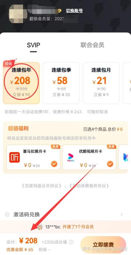 百度网盘超级会员年卡:新用户188/年,老用户208/年,无优惠通道为298/年。(续费时价格高于208元,需先去续费管理,取消自动续费,再重新登录购买即可)
