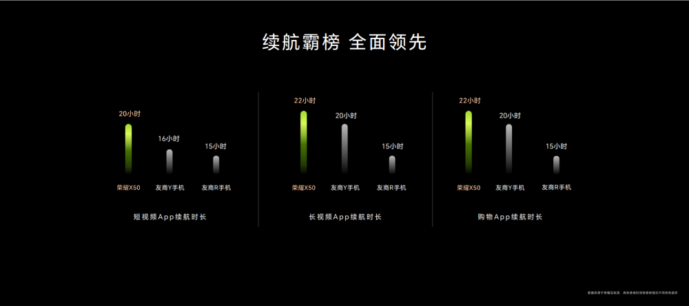 荣耀X50拥有短视频APP续航20小时、长视频App及购物APP续航22小时的水平,表现远超竞品,妥妥的“续航神器”。