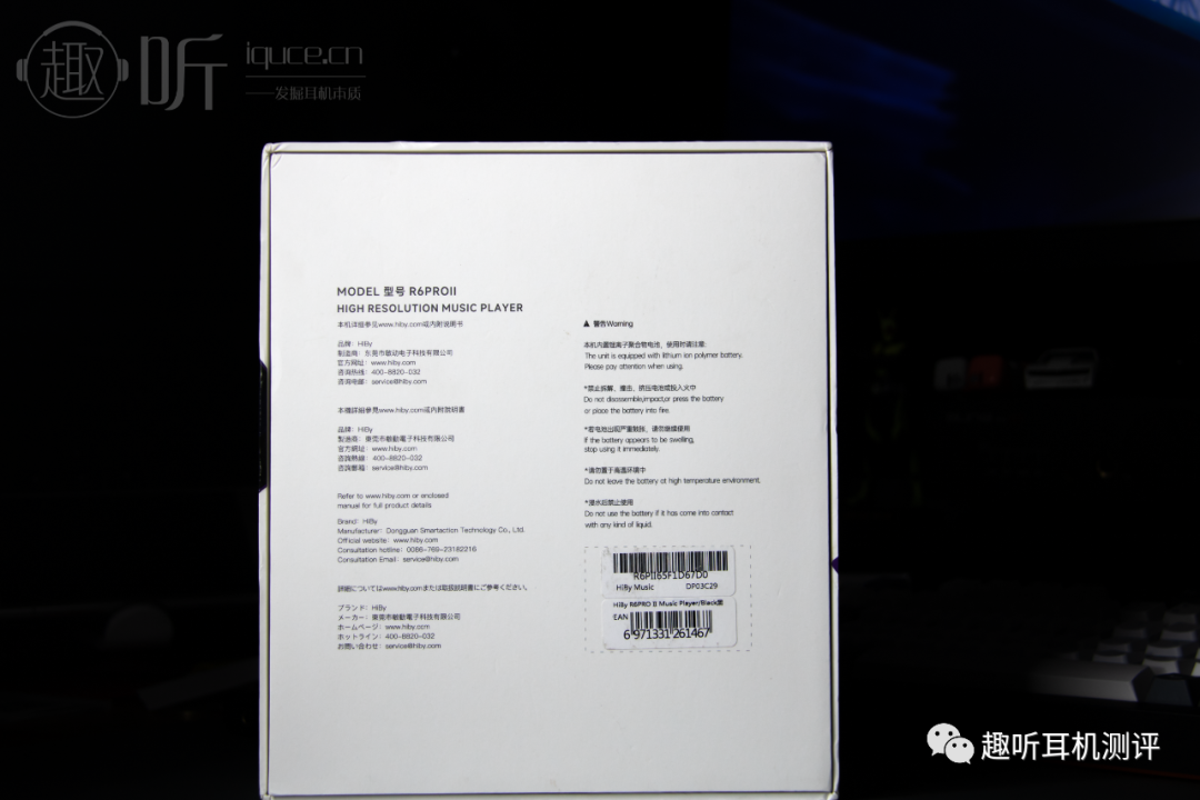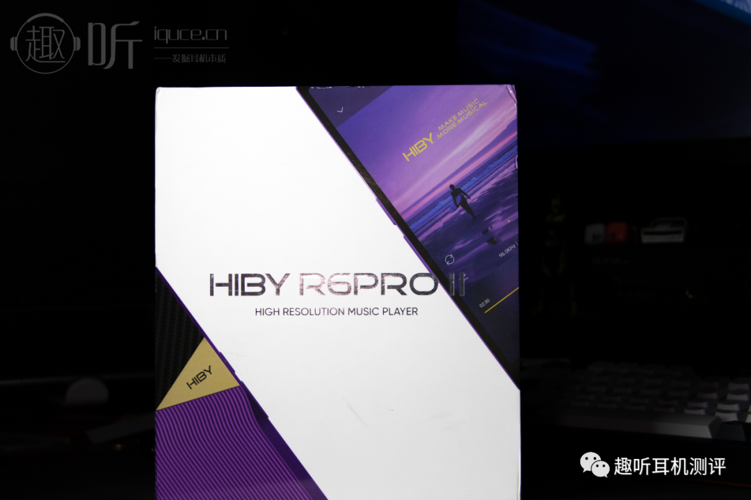R6Pro II的包装体积在播放器中算大的一种了,整体四四方方,正中间是烫银的名称,两侧对角还有紫色机身的渲染图,在播放器包装盒里这种设计还是挺有新意的,不过我这台是黑色的,如果是能够和机身颜色对应的话开箱体验也会更好一些。背面一如既往标注了产品参数信息。