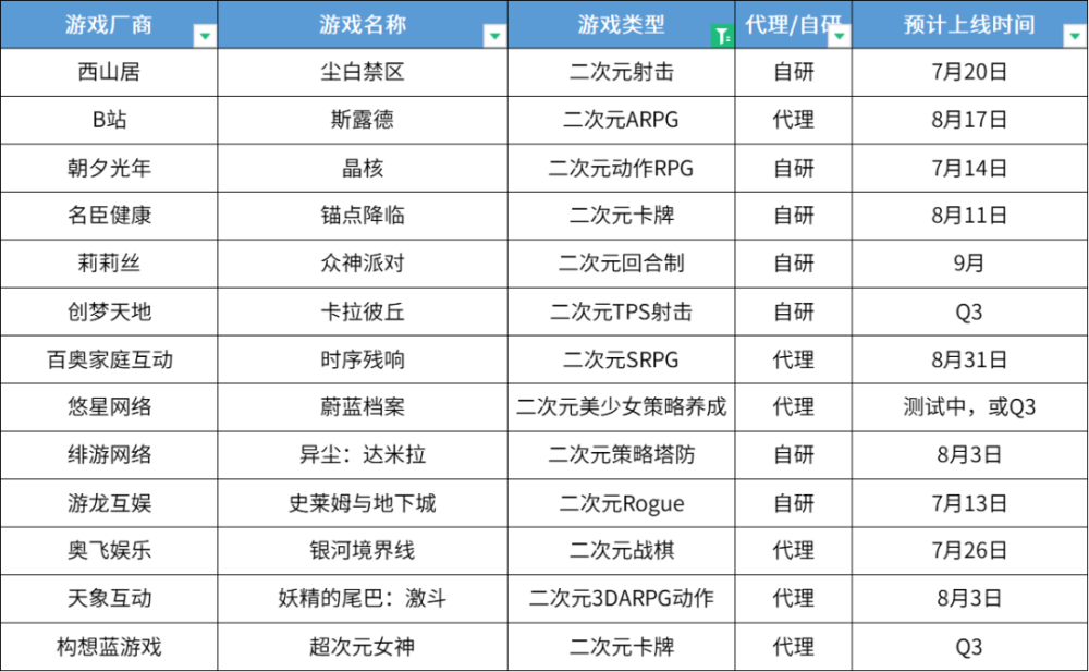 近期,游戏陀螺通过查询App?Store、TapTap、好游快爆、七麦等平台,搜索企业财报信息及内部咨询的方式,粗略统计了腾讯、网易、中手游、朝夕光年等48家游戏厂商69款新品。以期让大家了解今年“暑期档”游戏市场的激烈战况(注:小部分游戏上线时间具有不确定性,或存误差,仅供参考)。