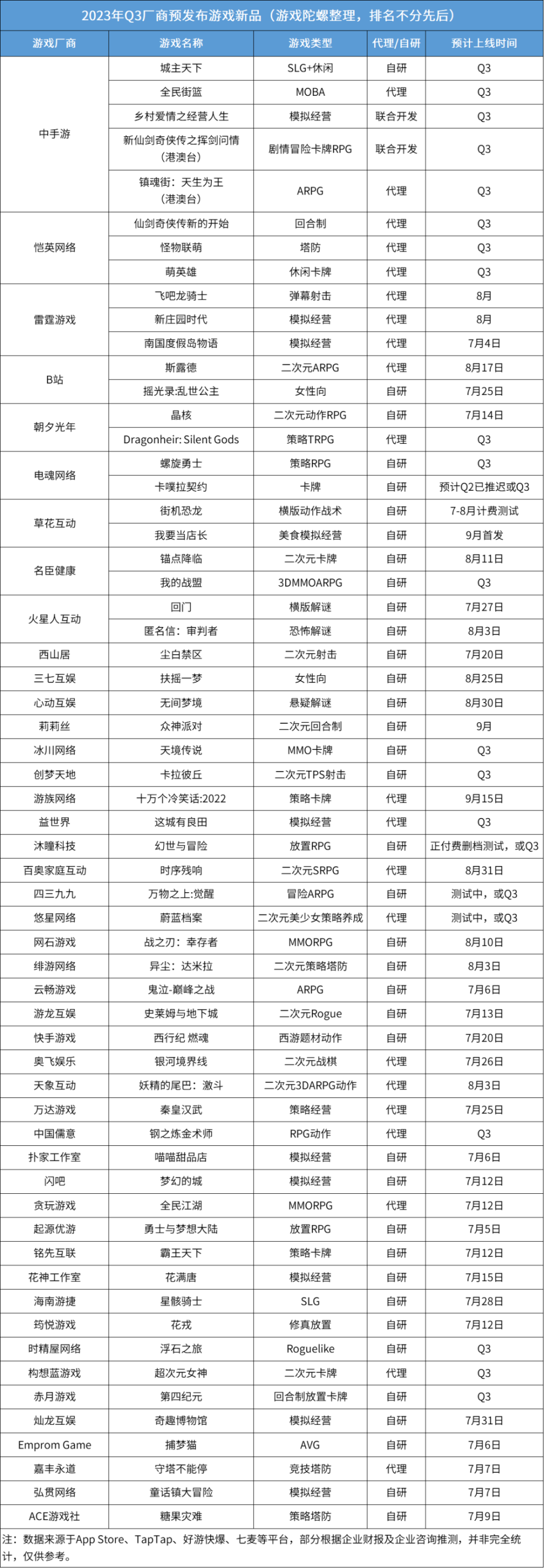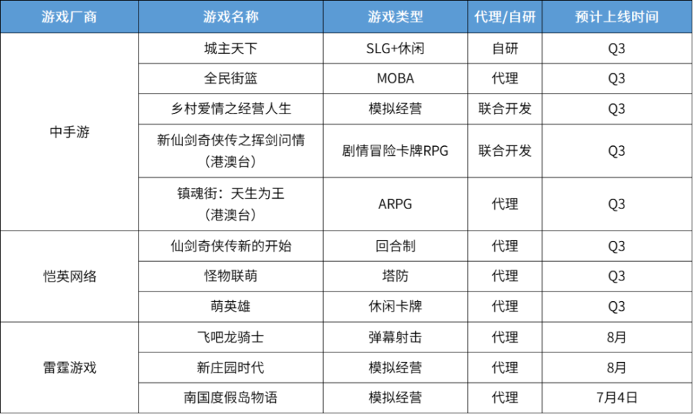 网易方面,Q3预计上线3款新游:SLG《三国诛将录》、体育竞技《全明星街球派对》与非对称竞技《零号任务》。