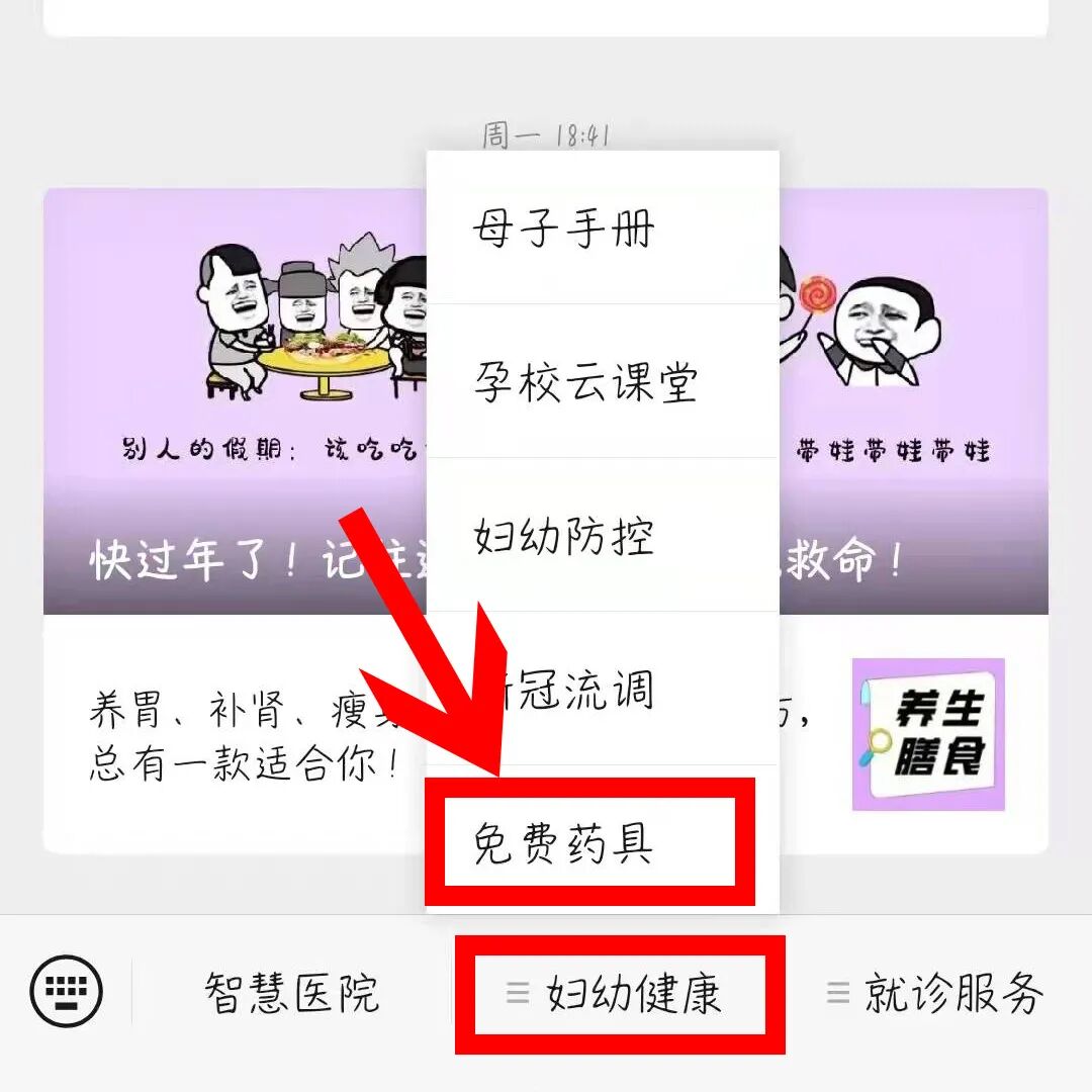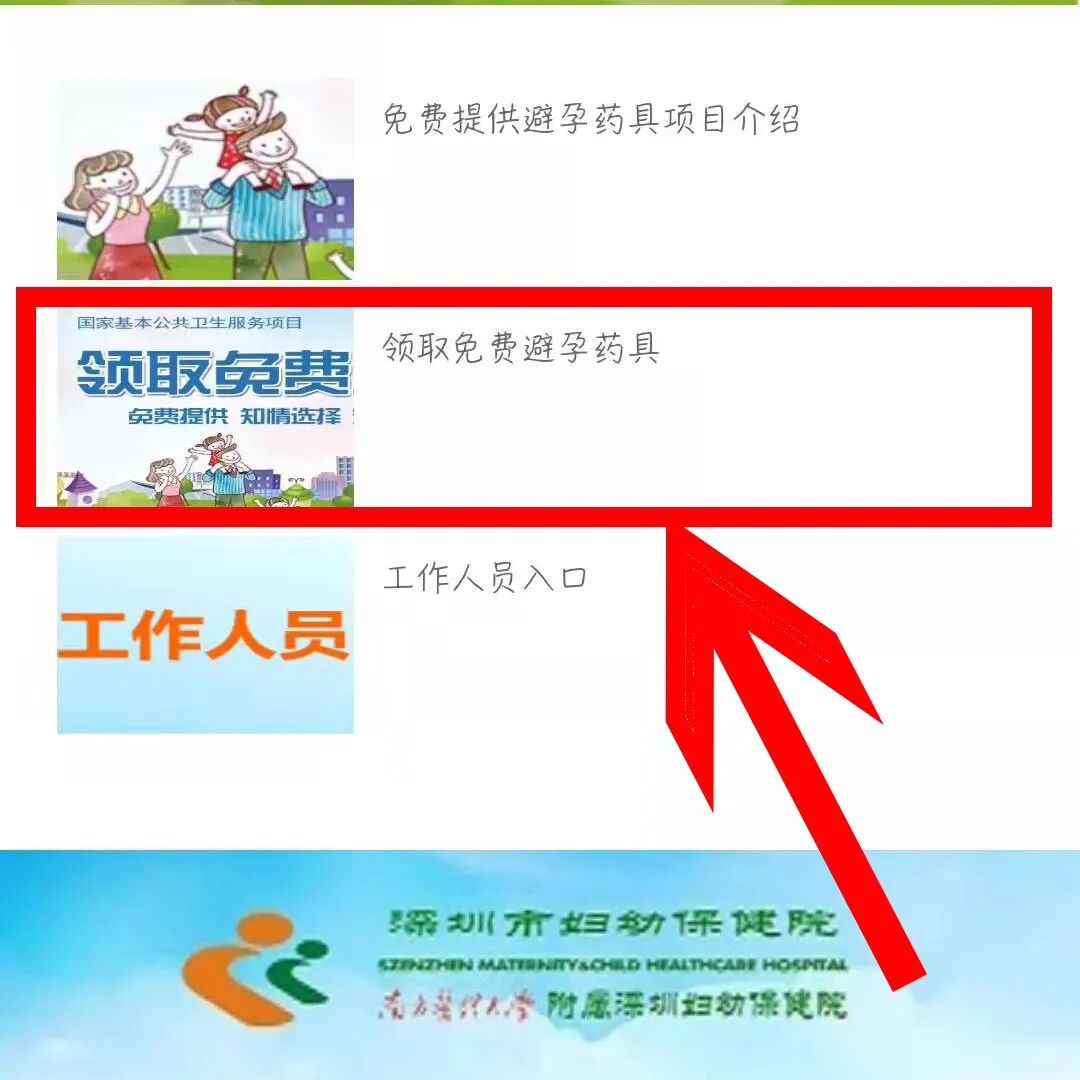 在“深圳市妇幼保健院”菜单栏点击【妇幼健康】→【免费药具】→【领取免费避孕药具】→【在线领取】
