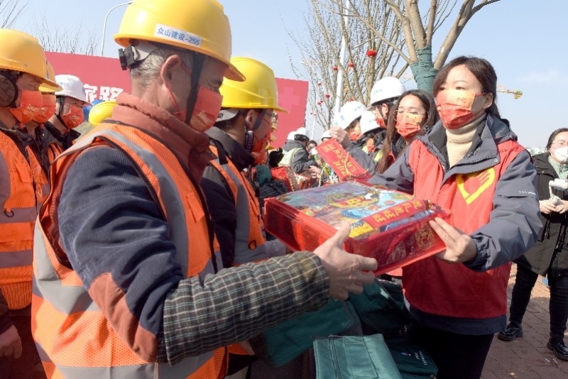 1月16日,合肥志愿者为即将返乡的中建四局六公司的工人发放年货礼包。 新华社发