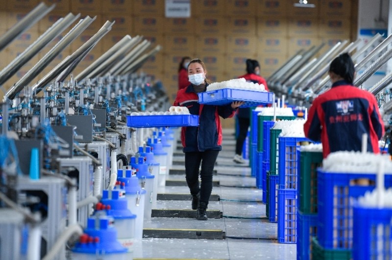在锦屏经济开发区贵州亚狮龙体育文化产业发展有限公司羽毛球生产基地,工人搬运羽毛球。? ? 新华社发