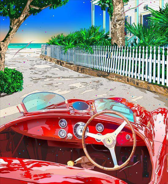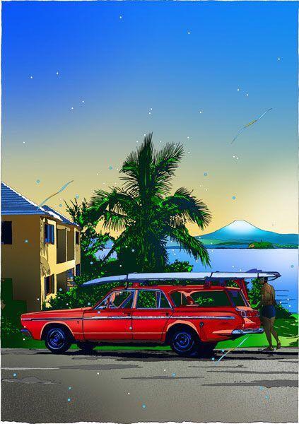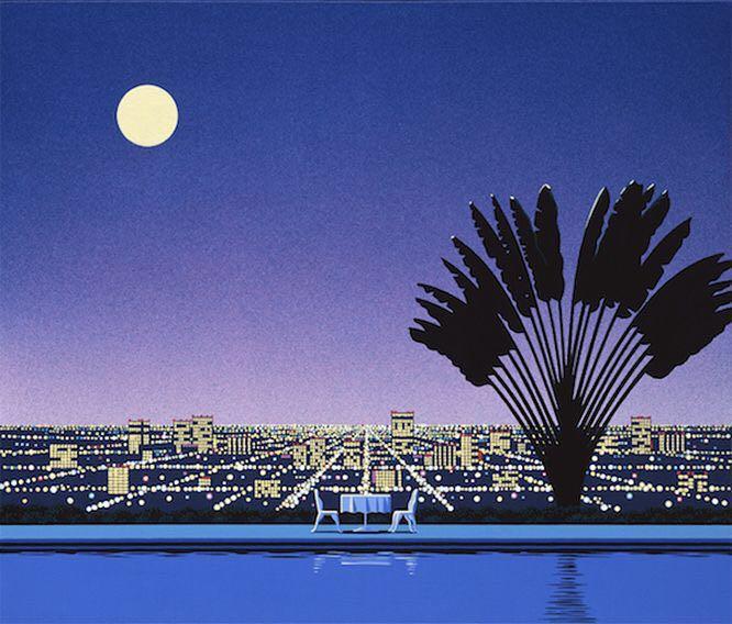 如果说永井博创造了一个不可能的世界观的话,那么铃木英人则是将现实生活变得不可思议,两个人的风格初看感觉很类似,受美国文化的影响很强对光影的把握也很纯熟,但铃木的作品完成难度更高。他首先是一个摄影师,80%的作品都是现地取材,之后通过胶片正片投影在玻璃板上进行再创作,制作工艺和绘画难度都很高。港口的私人游艇,50年代的美式招牌,海边的冲浪者,老夜车,在本就光彩夺目的基础上,变得更加鲜艳,物体反射形成的光晕被描绘成“漂浮的瓢虫”被风吹散在空中。擅长的墨线绘图,让作品的还原度极高,看上去亦真亦幻。用松本隆创造的“风街”来形容他的作品再合适不过。