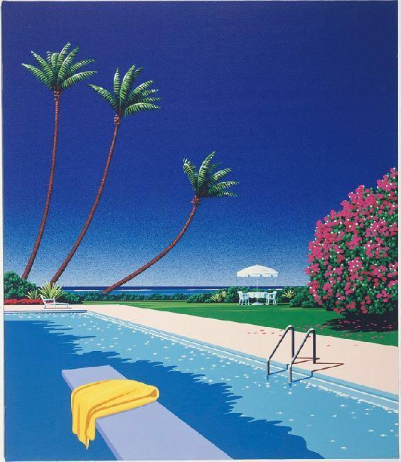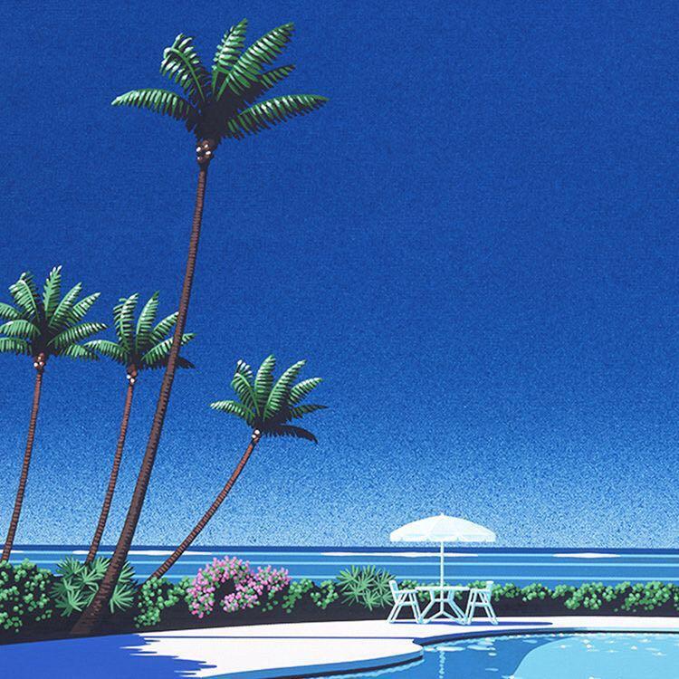 特别喜欢永井博和铃木英人的插画,蓝色高对比度的画面,强烈下数目车辆产生的浓实的阴影,无人的沙滩,或是海滨度假酒店,白色阳伞下的鸡尾酒,美国典型的大型停车场,这是属于永井博最典型的风格,炙热和清凉感并存。谈到创作风格时,永井博表示自己受照相写实主义的影响非常大,70年代初,这类型艺术在美国开始流行,他也是在那时第一次看到了这样的展览而被震撼。他回忆有一天坐飞机到旧金山,正在往机场停车场走,当时骄阳烈日,阳光照射在一辆皮卡车上,在地面上形成了几乎全黑的阴影,那一瞬间他便决定了自己未来的画风。看他的画,感觉在一个完全不了解的世界,只可以欣赏而无法介入,平行于我们的生活。