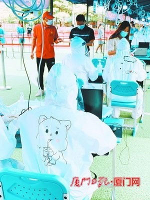 数以千计的教师上完网课,放下教鞭,有的穿上红马甲,成为“小红”,有的穿上蓝色隔离服,成为“蓝精灵”,或是穿上白色防护服,成为“大白”。无论“小红”“蓝精灵”还是“大白”,他们是厦门本轮抗疫不知名志愿者的重要组成,有的负责维护核酸检测点的秩序,有的负责信息录入。