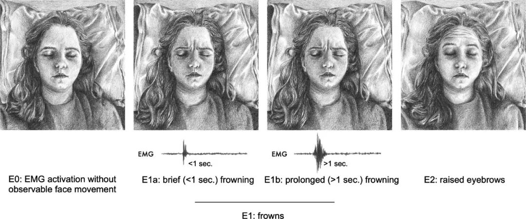 在睡眠的各个时期也可能出现幸福的笑容 |图源:参考资料2但是从微笑(0.023次/小时)和皱眉(2.33次/小时)的频率来看,我们睡着的更多时间可能还是皱着眉头。可能你在做美梦,但睡觉时的真实表情却仍然皱眉痛苦的。不过,对于RBD睡眠障碍患者来说,他们睡觉时候可能会看起来“更痛苦”。研究就发现,RBD患者在REM期,眉毛会活动得更加灵活,长时间皱眉的频率也更高。而且他们不仅会皱眉,还会作出其他更消极的表情,看起来比健康对照组要痛苦许多。他们在几秒内变化着“痛苦面具”:皱着眉头,嘴角下拉,眼睛紧紧地闭着,仿佛是在喊叫、哭泣和呻吟,有些人甚至还说梦话并打了自己一巴掌。可能是睡眠不好,情绪不佳,也有可能是身体疼痛。