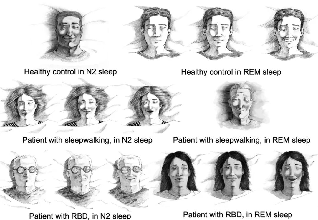 睡觉时你的表情很可能是这样的 | 图源:参考资料1我们往往难以得知自己睡着时是什么表情。在这项试验中,当受试者熟睡时,他们的面部表情会被视频记录下来。还会在用于皱眉的肌肉上摆放两个电极,测量睡觉时候皱眉肌的肌电图。简单来说,就是看人睡觉,而且对睡觉时出现的表情进行描述和评分。研究者们收集了91名成年受试者,114个夜晚的睡眠视频和生理特征。其中包含睡眠没问题的健康被试、大声打鼾的阻塞性呼吸暂停综合征患者,躺下时会腿部抽动的不宁腿综合征患者、快速眼动期行为障碍(RBD)患者、失眠患者、特发性嗜睡症患者、帕金森病患者等等。RBD是一种睡眠障碍,具体的表现就是在做梦的时候(通常是快速眼动期,REM),身体总是会表现出一些夸张的动作,比如大喊大叫,哭泣,手舞足蹈,拳打脚踢等等,甚至可能会使自己或同伴受伤。这种病容易在60岁以上的人群中发生,有可能与帕金森病等其他神经退行性疾病有关。