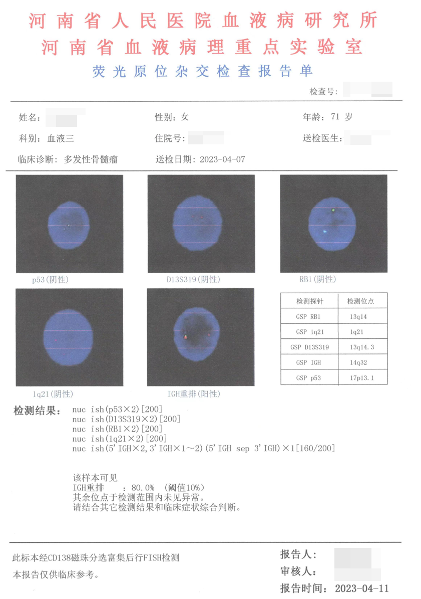 其胞核大小不等,类圆形,核圆形,多偏位,染色质较粗,核仁1-2个,多不清晰,胞浆量丰富,呈蓝紫色,有泡沫感及核旁淡然区,可见双核及巨大多核浆细胞。经CD138磁珠分选富集的浆细胞原位荧光杂交结果显示IGH重排为80%(阈值10%),CCND1/IGH融合基因为87%(阈值10%)。