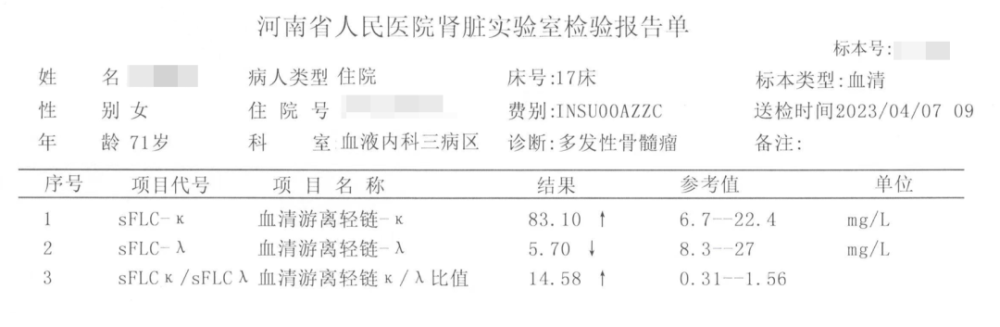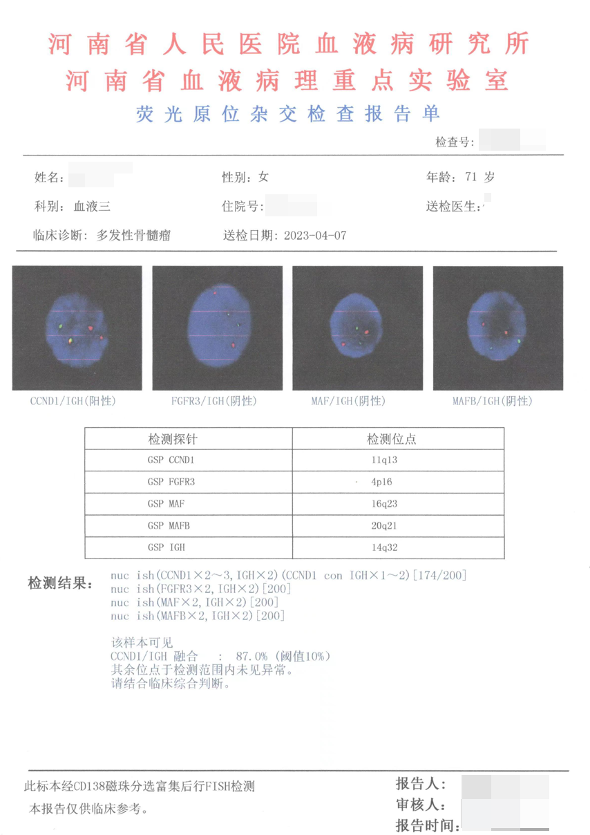 随后我们查看了该患者血、尿中游离轻链的结果,血清和尿液中kappa轻链轻度增高,kappa:lambda比值异常。骨髓活检结果及骨髓象中均提示异常浆细胞的增多,荧光原位杂交报告中显示存在IGH重排和CCND1/IGH基因融合。