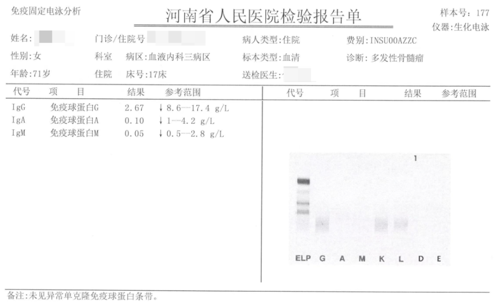 针对医生提出的质疑,我们将该患者的血样找出,复检了免疫固定电泳,同时使用IgD和IgE抗体,结果仍为阴性,未见异常单克隆免疫球蛋白条带。