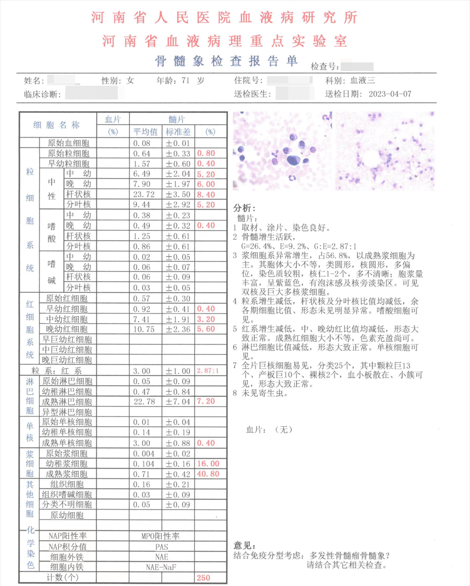 髂后上棘骨髓穿刺活检结果显示,骨髓增生减低,免疫组化染色CD38(+),CD138(+),Kappa(+),Lambda(-),CD20(-),CD56(-),P53(+),MUM-1(+),Kappa单克隆浆细胞骨髓瘤细胞占有核细胞的30%。骨髓象检查报告单结果中浆细胞系异常增生,占56.8%,以成熟浆细胞为主。