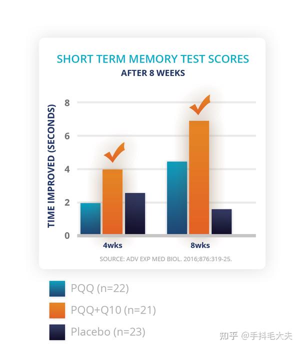 而在另一项斯特鲁普认知力测试(成人20mg-40mg/天)中,PQQ组认知能力明显高于安慰剂组;PQQ与辅酶Q10合用对认知能力的提高作用更加明显。