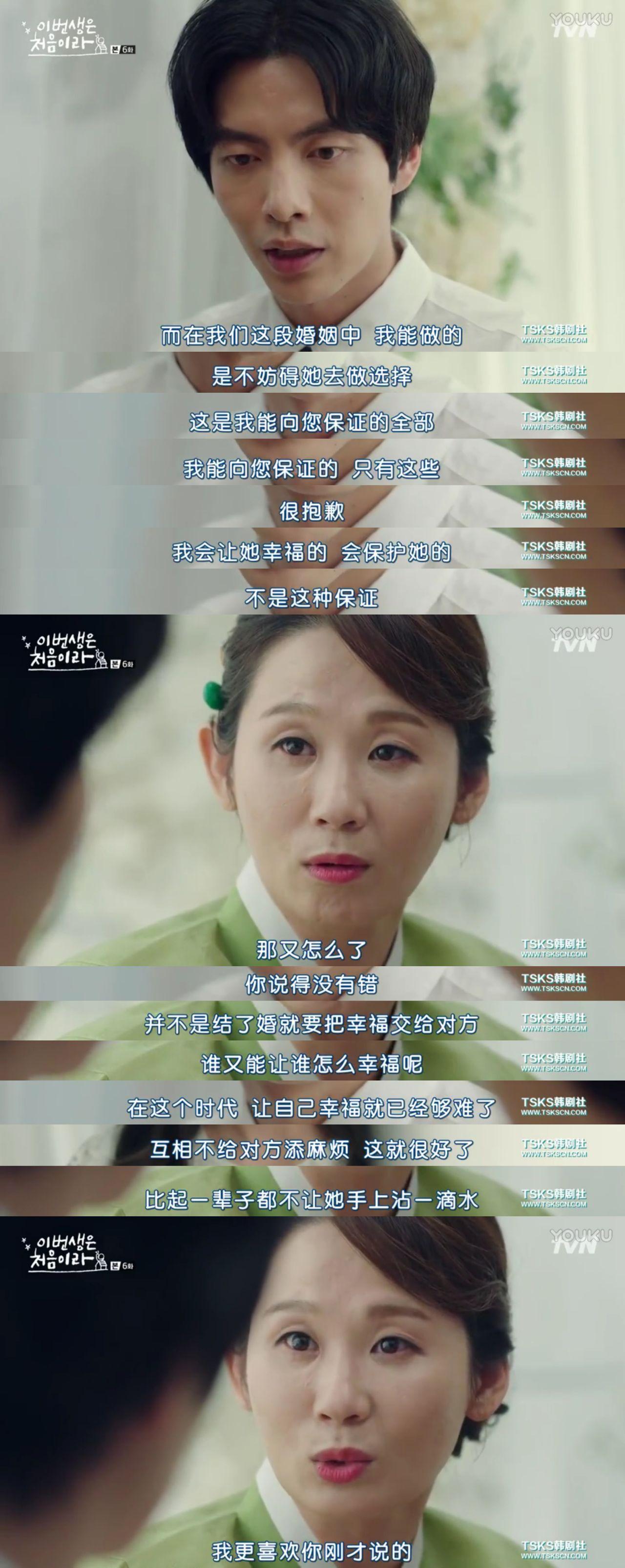 和女主同样30岁的我,刚开始也没理解母亲的做法,办婚礼那么费劲能省就省啊。后来才发现编剧真的太写实了,婚姻一旦定下基调就很难改变了。上一辈人有很多不甘,却迫于各种无奈委屈的活着,但心底还是希望自己的孩子能够活出自己的人生。以前不理解,对于爱情婚姻等等皆是美好的幻想,直到随着年龄增长,更客观更理性的看待婚姻,才发现母亲是用她们的一生来帮助孩子完成理想,而这些是包括父亲在内的男权思想所无法理解的。编剧太赞了,而这么三观正的韩剧收视却一般,但是评分绝对不会低。