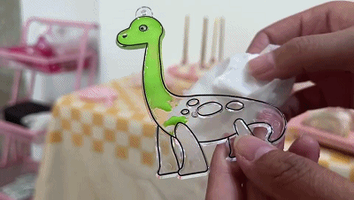 玩起来可以说是「傻瓜式」操作,只需要将不同颜色的颜料挤在透明挂件上,静静地放置 8 小时左右,等自然风干即可完成。