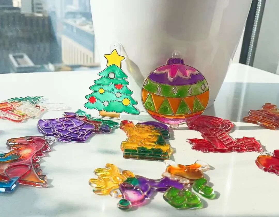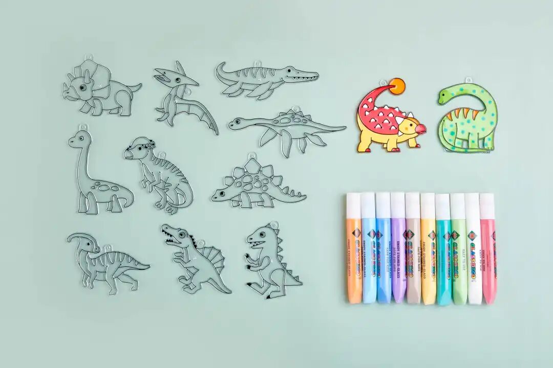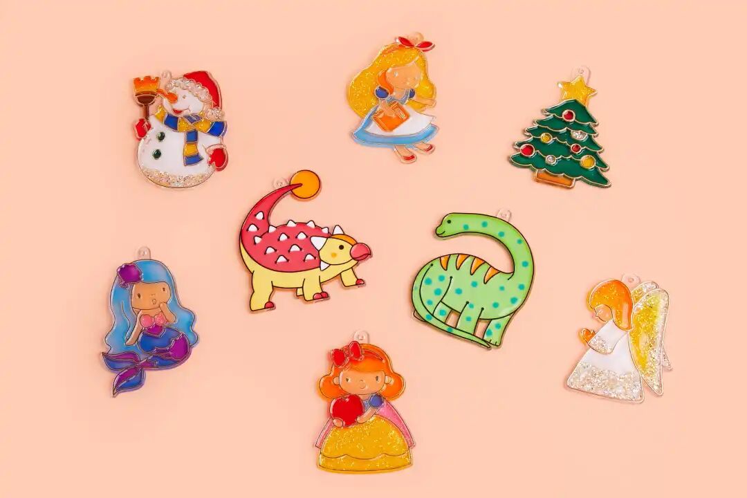 我选择了一套最热门的圣诞款主题和一套恐龙主题,盒装内含 12 个透明挂件以及 10 种不同颜色的颜料,做工非常精致,无毛刺,颜料的味道有一些淡淡的胶水味,但不刺鼻,小也光拿着透明挂件就能玩很久。