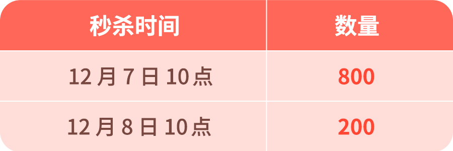一共限量 1000 份!就在「限时秒杀」频道抢,12 月 7~8 号,每天 10 点开始秒,一场秒杀持续 24 小时,现在就能抢