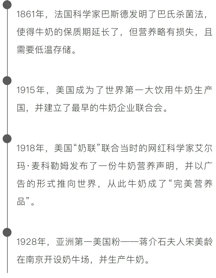 在近代中国,牛奶最先还是在北京、和沿海通商地区的一些人群中被享用。20世纪初,就有一些外籍商人开始在天津经营乳牛厂。据说,宋美龄酒为自己建立了专供的奶牛厂。南京沦陷前期,宋下令把自己的奶牛运到重庆,随后又运到成都。广东、江浙沪等其他沿海地区也开始逐渐有侨民和外国集团开设奶厂。然而,到新中国成立时,中国每年的人均牛奶消费量也仅有 0.4 公斤。牛奶,似乎从来就不是中国人餐桌上的必需品。