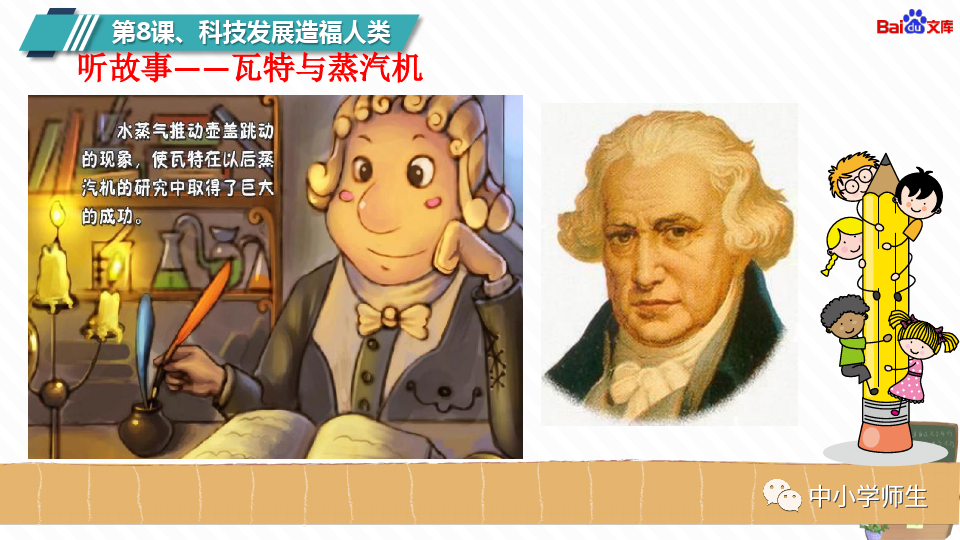 (2) 第一次工业革命时期:工业革命时期的标志是动力革命, 先是用蒸汽机等机器来代替人力、 畜力、 风力、 水力等天然动力,带动了采煤、 钢铁、 交通等事业的发展。(媒体出示:瓦特和当年的蒸汽机〉 第二次工业革命时期(通过媒体播放一段早期的电影制作)