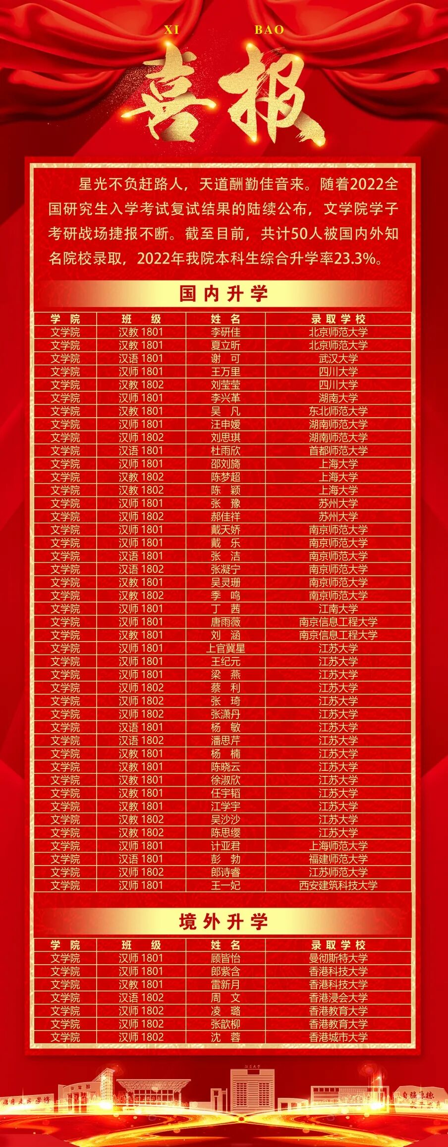 你们好!江苏大学文学院位于江河交汇、人文荟萃的历史文化名城镇江,在两千多年的历史长河里,孙权、刘备、刘裕、玄奘在这里书写传奇,萧统、刘勰、沈括、米芾在这里书刻经典,王昌龄、周敦颐、苏轼、辛弃疾在这里留下千古名篇,马建忠、吕叔湘等汉语语言学名家从这里走向世界。文学院将以文化人、开拓创新内化为学院的精神品格,以“博文、笃学、致远”的精神,创新人才培养理念,注重人才培养质量,搭建了基础与应用并重,本、硕兼备的双轨发展的育人体系,致力于培养创新型、国际化、复合型一流人才。部分毕业生被美国哈佛大学、北京大学、香港中文大学等海内外名校录取为研究生;我们的杰出校友工作在教育、政府、文化等企事业单位的重要岗位。我们竭诚欢迎有志于学习中国语言文学和汉语国际教育专业的每一个优秀的你——加入文学院!