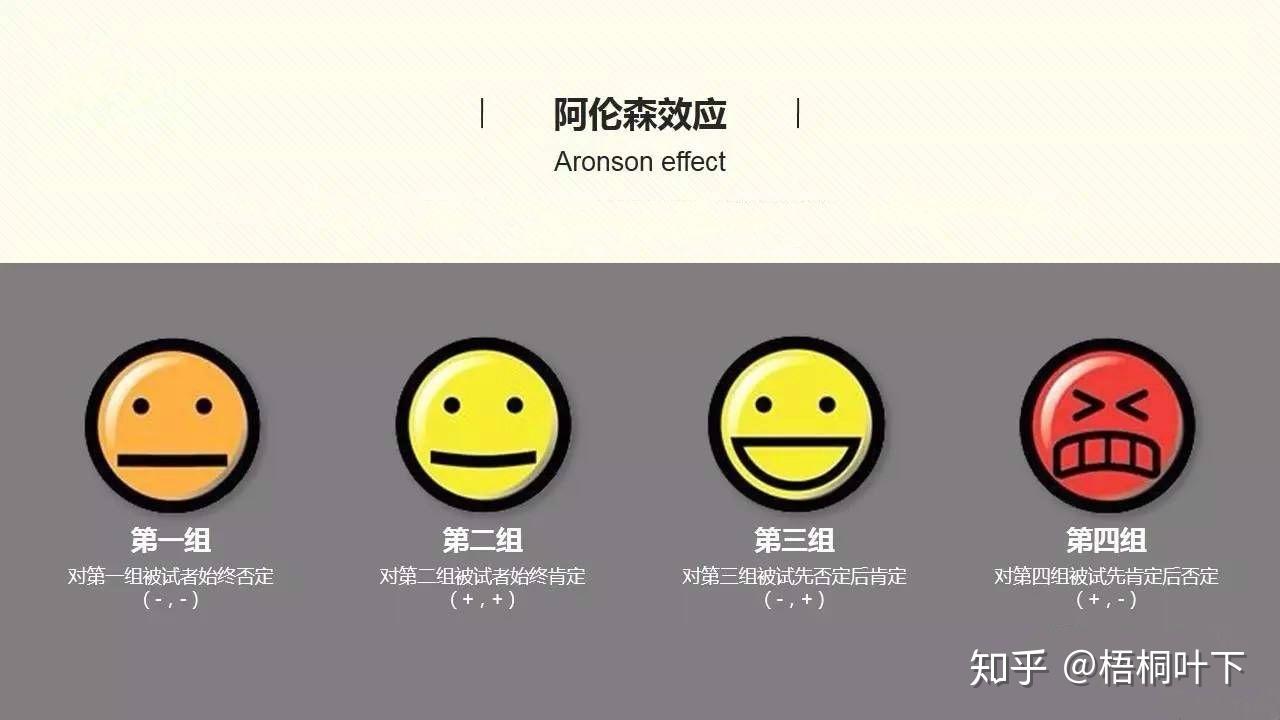 是指人们最喜欢那些对自己的喜欢、奖励、赞扬不断增加的人或物,最不喜欢那些显得不断减少的人或物。【实验】分4组人对某一人给予不同的评价,借以观察某人对哪一组最具好感。第一组始终对之褒扬有加,第二组始终对之贬损否定,第三组先褒后贬,第四组先贬后褒。【结果】此实验对数十人进行过后,发现绝大部分人对第四组最具好感,而对第三组最为反感。【应用】阿伦森效应提醒人们,在日常工作与生活中,应该尽力避免由于自己的表现不当所造成的他人对自己印象不良方向的逆转。同样,它也提醒我们在形成对别人的印象过程中,要避免受它的影响而形成错误的态度。【实例】1、有效利用 在宿舍楼的后面,停放着一部烂汽车,大院里的孩子们每当晚上7点时,便攀上车厢蹦跳,嘭嘭之声震耳欲聋,大人们越管,众孩童蹦得越欢,见者无奈。这天,一个人对孩子们说:“小朋友们,今**们比赛,蹦得最响的奖玩具手枪一支。”众童呜呼雀跃,争相蹦跳,优者果然得奖。次日,这位朋友又来到车前,说:“今天继续比赛,奖品为两粒奶糖。”众童见奖品直线下跌,纷纷不悦,无人卖力蹦跳,声音疏稀而弱小。第三天,朋友又对孩子们言:“今日奖品为花生米二粒。”众童纷纷跳下汽车,皆说:“不蹦了,不蹦了,真没意思,回家看电视了。”分析:“正面难攻”的情况下,采用“奖励递减法”可起到奇妙心理效应。2、反例 小刚大学毕业后分到一个单位工作,刚一进单位,他决心好好地积极表现一番,以给领导和同事们留下非常好的第一印象。于是,他每天提前到单位打水扫地,节假日主动要求加班,领导布置的任务有些他明明有很大的困难,也硬着头皮一概承揽下来。 本来,刚刚走上工作岗位的青年人积极表现一下自我是无可厚议的。但问题是小刚的此时表现与其真正的思想觉悟、为人处世的一贯态度和行为模式相差甚远,夹杂着“过分表演”的成分。因而就难以有长久的坚持性。没过多久,小刚水也不打了,地也不拖了,还经常迟到,对领导布置的任务更是挑肥拣瘦。结果,领导和同事们对他的印象由好转坏,甚至比那些刚开始来的时候表现不佳的青年所持的印象还不好。因为大家对他已有了一个“高期待、高标准”,另外,大家认为他刚开始的积极表现是“装假”,而“诚实”是我们社会评定一个人所运用的“核心品质”。4.安泰效应安泰是古希腊神话中的大力神,他力大无穷,无往不胜。因为他只要靠在大地上,就能从大地母亲那里汲取无穷的力量。他的对手发现了这个秘密,便诱使他离开地面,在空中杀死了他。因此,要学会依靠大家、依靠集体。5.暗示效应 所谓“暗示效应”,即是用含蓄的、间接的方式对别人的心理和行为施加影响,从而使被暗示者不自觉地按照暗示者的意愿行动……此称之为“暗示效应”。少年儿童较XXXXX更易于接受暗示。在音乐课堂教学过程中,教师可以通过语言暗示、动作暗示,表情暗示、自我暗示等方法提高教学效果。 语言暗示——积极的语言能使人产生积极的情绪,改变消极的心态,因而教师可以有意识地用“你真聪明”“你一定行”等语言为孩子打气,还可以让学生之间相互鼓励,比如:领:我很棒!(XX)众:你很棒!(XX)领:你也行!(XXX)众:我也行!(XXX) 动作暗示——音乐是一种看不见摸不着的抽象艺术,低段学生对音乐作品的情绪、思想内涵更不容易把握,这时候动作暗示就显得尤为重要了。教师能用肢体动作暗示学生,使学生更快地理解音乐作品。例如在表现音乐情绪方面,教师可以用左右轻轻摆动身体来表示轻柔舒展的音乐,用小幅度的点头来表示欢快活泼的音乐。 表情暗示——小学低段音乐教学中有许多的表演环节,包括唱歌表演、律动表演、乐器表演,形式上又包括集体表演、小组表演、个人表演等。在这些环节中教师就要充分发挥表情暗示的作用。当学生在表演时,教师如果是微笑的注视着他们,那么对学生来说就是一种莫大的鼓励,他们能看到老师眼里的肯定和赞许。而在对学生音准的训练过程中,可运用柯达伊手势的动作暗示,让学生对抽象的音高有比较直观的理解。有一个班在学习歌曲《可爱的羊群》的第三句“水草丰盛羊儿壮 ”时,总是把最后一个音“5”漏掉。所以当唱到这几小节时我就用手势作出旋律高低的走向,到了最后一个音“5”时,我的手向上一带,学生的自然的就唱到位了,几遍之后便能完全掌握。 自我暗示——教师还要教育学生学会自我暗示,使学生在音乐学习体验中更好的发挥自主性。有的学生每当遇上听辨练习就会有“惨了!惨了!”“好难啊!” 等自我暗示,在学习上维持着焦虑状态,从而干扰正常水平发挥。这种思维习惯一旦形成就会严重阻碍教学的效果。所以教师要让学生学会积极的自我暗示,想着自己一定能一定做的到。 另外教师的课堂展示也是一个客观实在的态度暗示,具体体现在教师的精神状态以及对音乐作品表现的投入程度上。6.安慰剂效应 所谓安慰剂,是指既无药效、又无毒副作用的中性物质构成的、形似药的制剂。安慰剂多由葡萄糖、淀粉等无药理作用的惰性物质构成。安慰剂对那些渴求治疗、对医务人员充分信任的病人能产生良好的积极反应,出现希望达到的药效,这种反应就称为安慰剂效应。使用安慰剂时容易出现相应的心理和生理反应的人,称为“安慰剂反应者”。这种人的特点是:好